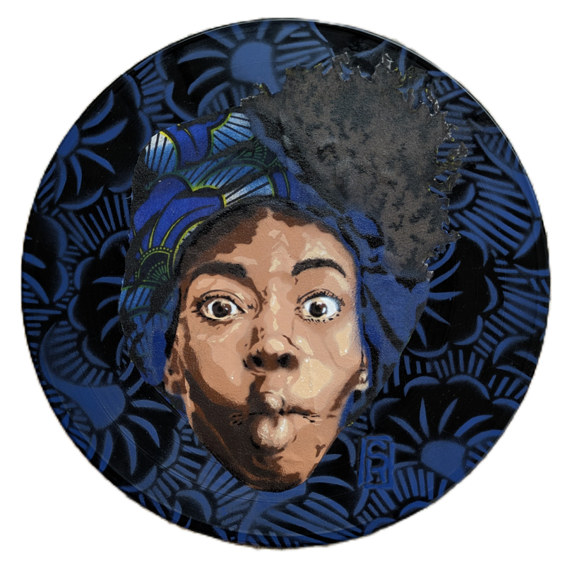 Portrait sur tissu WAX réalisé aux sprays et pochoirs collé sur vinyle recouvert lui même d'un pochoir “Fleurs de mariage” bleu réalisé aux spray.
